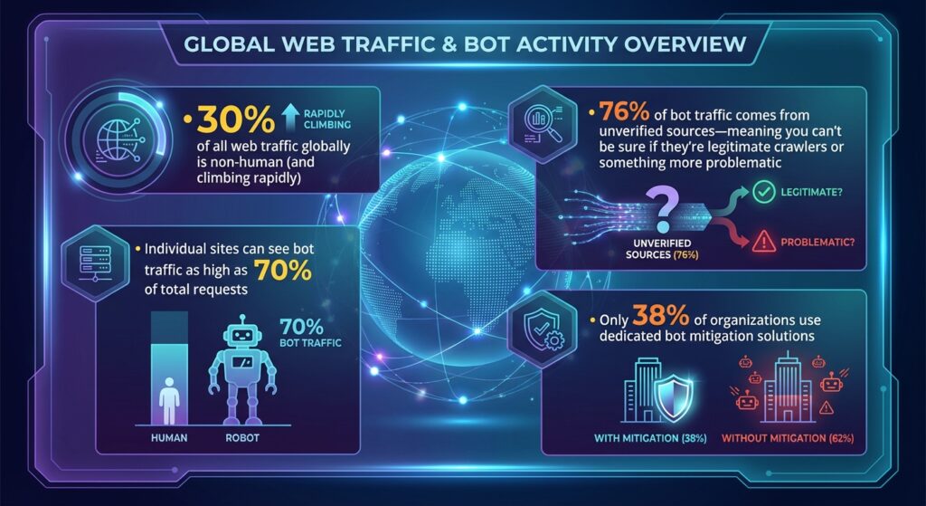 Global data shows that non-human traffic now averages roughly 30% worldwide, with significantly higher concentrations in North America. Much of this growth is driven by AI crawlers, large language models, and unverified bots scraping content or consuming server resources.